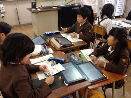 豆電球、乾電池、ソケット、導線を使い明かりをつける実験をタブレットで撮影し、実験の結果にペンツールで書き込みをしました。これによって、子どもたちの考えが「見える」ようになります。それをもとに、班で意見を交流しました。