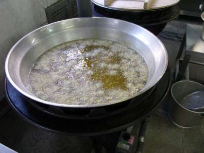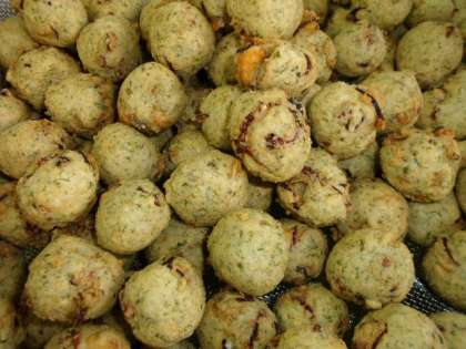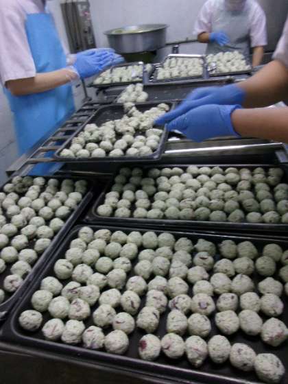 今日の給食の「たこボール」は、給食に「たこ焼き」を登場させたいという思いから考えられたメニューです。とうふをベースにして、小麦粉、でんぷん、青のり、たこを混ぜてひとつひとつ丸め、油であげます。ソースは、トンカツソースとウスターソースに砂糖を加えた、ほんのり甘めのソースがかかりました。給食調理員さんが、どのたこボールにも、必ずたこが入るように気をつけながら、丸めてくださいました。