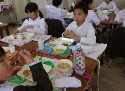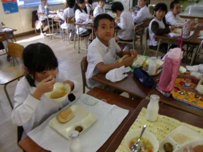 今日の給食は「ライ麦パン、たこボール、洋風煮、だいこんのサラダ、牛乳」でした。たこ焼きのようなたこボールを見た子ども達は、「たこ焼きや!」と言いながら給食を食べました。旬をむかえただいこんは、いちょう切りにして手づくりドレッシングをかけました。