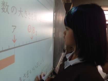 2組の様子です。ただいま、「1より小さい数」の学習を行っています。そう、「小数」です。今日は数直線を使い、小数の大きさについて考える授業でした。