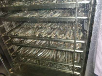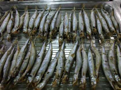 今日の焼きししゃもは、焼き物機でこんがり焼きました。一人2尾ずつあるので、1680尾のししゃもを、24枚のホテルパンに並べて焼きました。こんがり焼けたししゃもは、子持ちで食べごたえがありました。