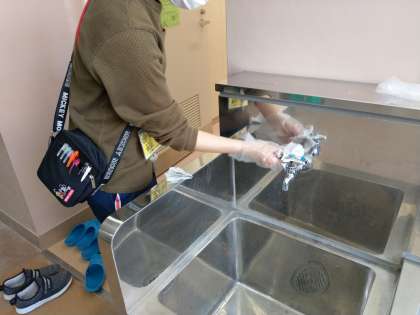 登校前と登校後には、机・椅子、ドアや窓の取っ手、照明のスイッチ等、次亜塩素酸ナトリウム溶液を希釈したものによる消毒を行っています。