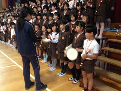 今日も講堂で練習を行いました。鍵盤ハーモニカやタンブリンも加わります。