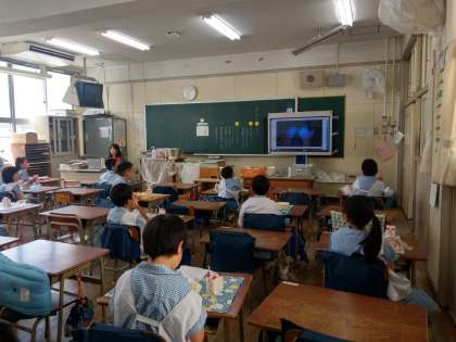 養護教諭が作成した、手洗い指導の動画を見ている様子です。