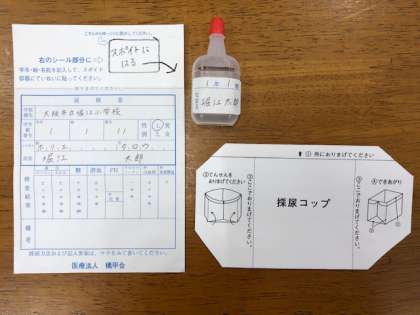 尿検査のキットを配布しましたので、紙袋と右上のシールに名前などを書いていただき、