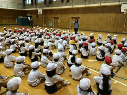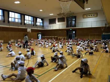 今日はあいにくの雨だったので、1年生全クラスで体育の授業を行いました。講堂で、すわりおにごっこをしました。床におしりをつけたままおにごっこをするので、にげるのも追いかけるのもたいへん!子どもたちは元気いっぱい、楽しんで身体を動かしました。