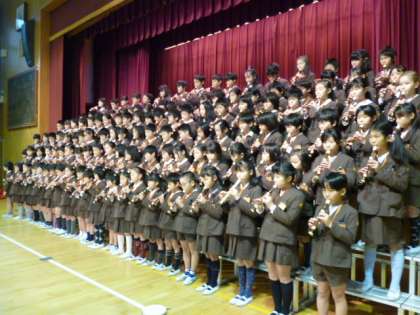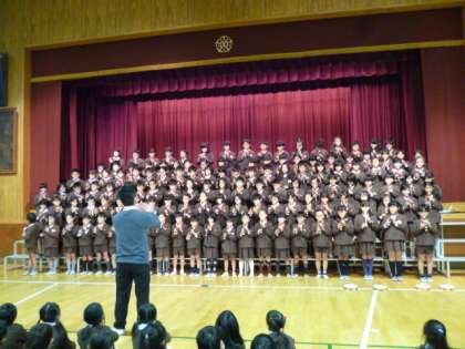 今日の児童朝会は、明日、3年生が西区音楽交流会で披露する楽曲を聞きました。