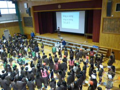 15分休憩に幼稚園児と本校児童のいきいき班で講堂に集まり、「うたよありがとう」を全員で歌いました。幼稚園児や1年生の児童に高学年の児童が、やさしく手本になるように歌ってあげていました。