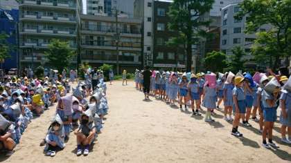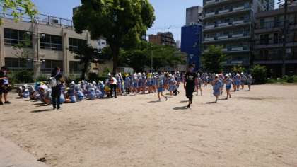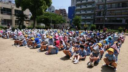 今回は運動場に避難した場合の密を避けるため、4年生と5年生はあみだ池公園へ避難しました。