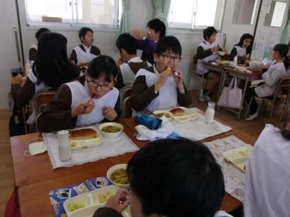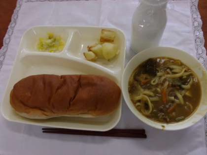 今日の給食は「黒糖パン、カレーうどん、焼きじゃが、はくさいの甘酢あえ、牛乳」でした。子ども達に大人気のカレーうどんは、あっという間に空になりました。焼きじゃがも香ばしく焼き上がり塩だけの味つけなので、じゃがいもの甘みを感じることができました。はくさいは甘酸っぱい味つけで口直しとなり、それぞれのおかずの味の変化が楽しめる献立でした。