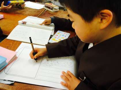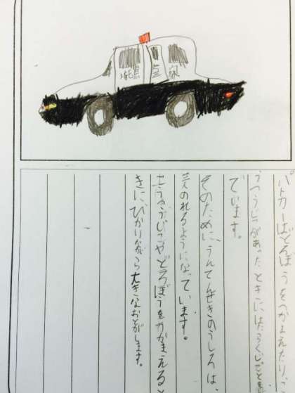 「しごと」と「つくり」に分けて書き、じどう車の絵もかきました。