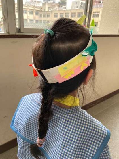 紙の輪に画用紙やビニルテープで楽しい飾りを付けました。