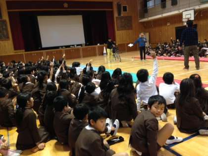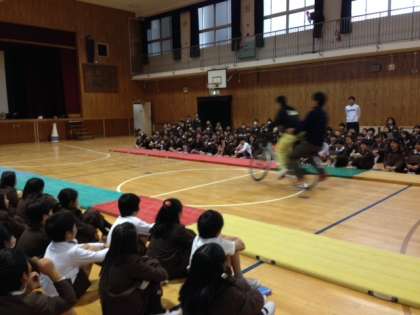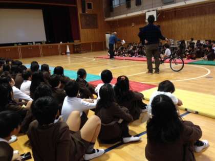 自転車に乗るときに絶対にしてはいけないことを学習したあと、先生たちによる“悪いお手本”を見て、まちがい探しをしました。みんな、すぐに分かったようですね。