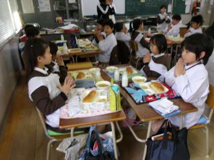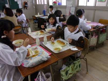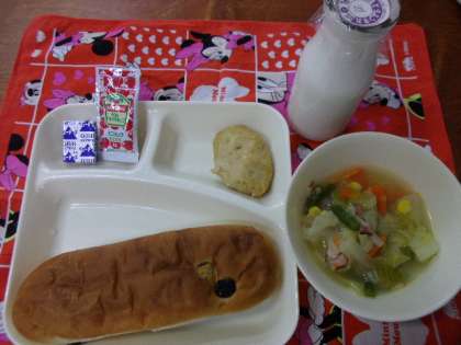今日の給食は「レーズンパン、とうふハンバーグ、じゃがいもとキャベツのスープ煮、固形チーズ、牛乳」でした。全員の給食が配膳されると、みんなでそろって「いただきます」をしました。とうふハンバーグはふわふわで、ケチャップをつけるととてもおいしく食べることができました。