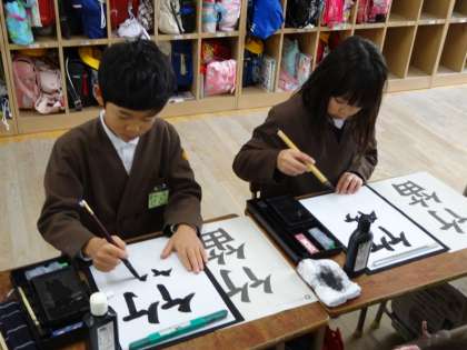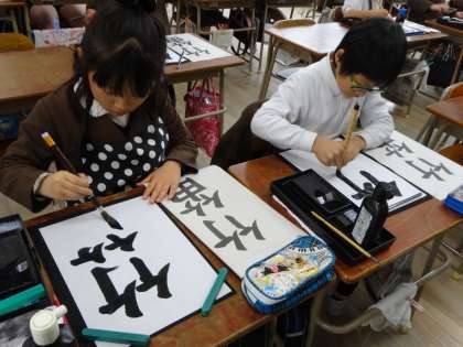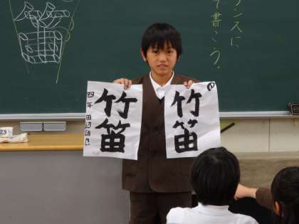 書写では、漢字の上下のバランスに気をつけて「竹笛」を書きました。