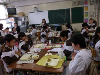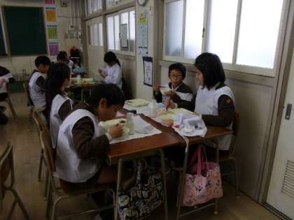 今日の給食は「ごはん、さばのみぞれかけ、みそ汁、おおさかしろなの煮びたし、牛乳」でした。魚を主菜にした和風献立です。おおさかしろなの煮びたしは、鶏肉を加えて、なにわの伝統野菜のひとつであるおおさかしろ菜を食べやすくしました。とうふやたまねぎ、にんじんなどの野菜、わかめが入ったみそ汁は出来たてで、寒い日にはからだが温かくなる一品でした。