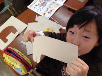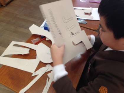 ボール紙や自分で選んだ材料で、“はん”をつくっているところです。はんが出来上がったら、カラーインクをつけて版画にします。完成が楽しみですね。
