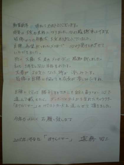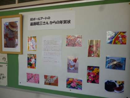 全国から東日本大震災で被災した福島県郡山市の避難所に寄せられた支援物資の梱包箱(段ボール)に絵をかいて、避難者の心を和ませ、勇気づける活動をされている段ボールアート作家の遠藤昭三さんに、5年生が新年に向けた目標を書いた年賀状を出しました。