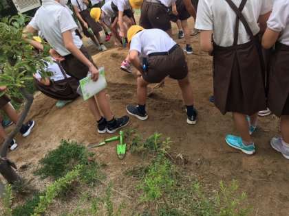 運動場の土山で流れる水のはたらきの実験をしました。班で協力しながら取り組んでいました。