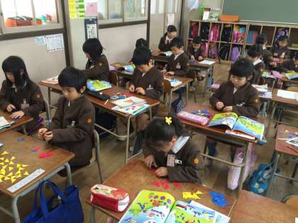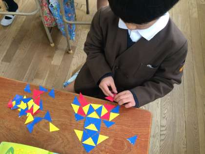 三学期がはじまり、子どもたちは新しい学習をがんばろうという気持ちでいっぱいです。今日はさんすうの時間に、三角形をたくさん切り取って、かたちづくりをしました。動物や乗り物、建物など、すきなかたちを考えながら作っています。