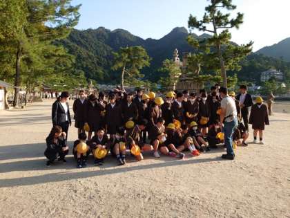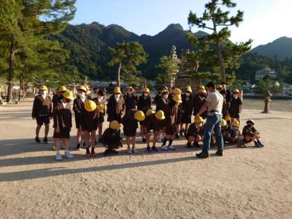厳島神社と弥山をバックに集合写真を撮影しました。