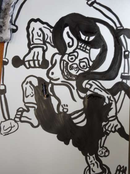 体の力強い動きを表現する描き方を学ぶために俵屋宗達の「風神雷神図」を真似て墨で描きました。