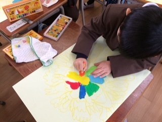 黄色のパスを使ってお花の下描きをし、カラフルな色彩を考えながらきれいに色をぬっていきます。「自分が妖精だったら、どんなお花にとまってみたいかな。」と声をかけると、花びらや葉の形を工夫して描いていました。