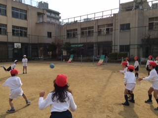 今日の体育は、1組から5組まで一緒にドッジボールをしました。休み時間に運動場で遊んでいることもあり、学年対抗戦で白熱した戦いでした。子どもたちも寒さを忘れるぐらい、必死でボールを投げたり、受けたりしていました。