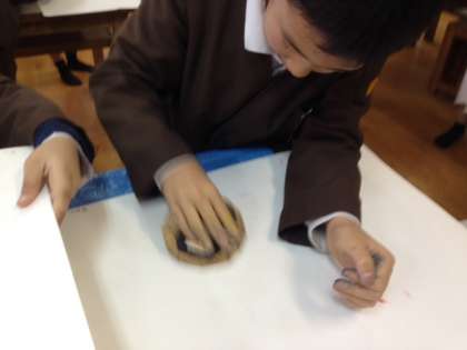 2学期に作った紙の“はん”にインクをつけ、版画にしました。