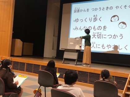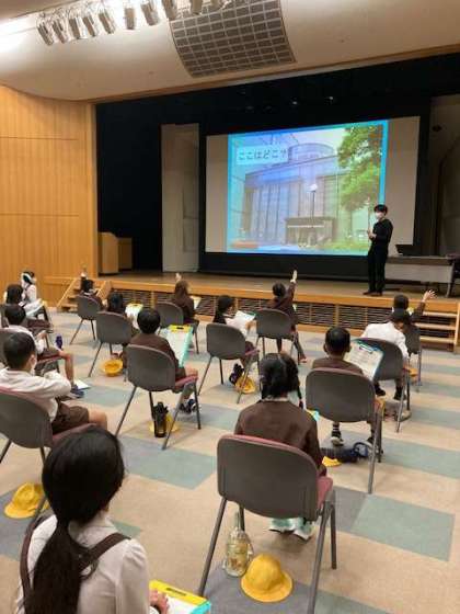 「図書かんに行こう」の学習で、中央図書館に見学に行きました。今日は、1.2.3組です。(他のクラスは、別の日に行きます。)