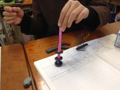 鉛筆を芯にして、穴あきのじしゃくを通します。