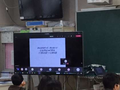 Teamsで全校朝会を行い、その後人権を考える集会を行いました。
