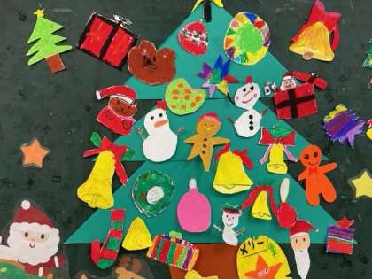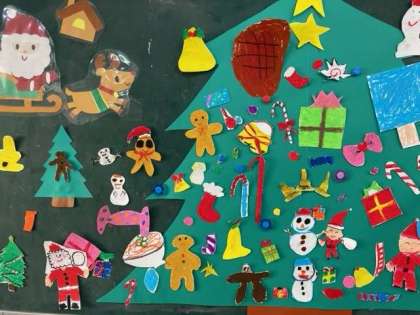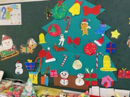 どのクラスも、子どもたちがつくった可愛い飾りがいっぱいの背面黒板です。