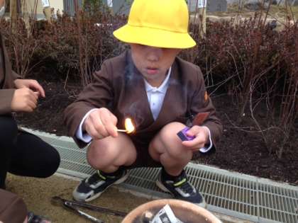 マッチにびくびくしながらも……「先生!点いたよ!」