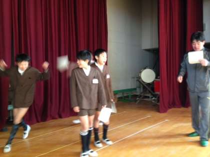 間もなく集会で発表のある運動委員会は、昼休みに講堂に集合し、劇の練習を行いました。キーワードは……