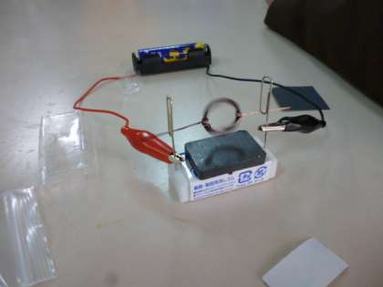 エナメル線を削って乾電池に巻きつけてコイルを作っり、それを磁石の上に吊るせば、簡単なモーターの出来上がりです。みんなうまく回ったでしょうか。