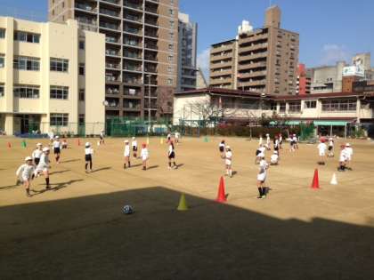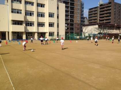 今日は運動場にミニコートをたくさんつくり、ラインサッカーのミニゲームをしました。先生も一緒になって駆け回りました。かけ声がたくさん出ていて、よい雰囲気でゲームを進めることができました。