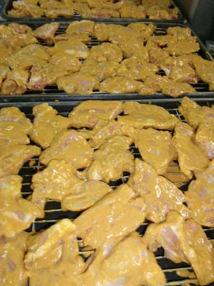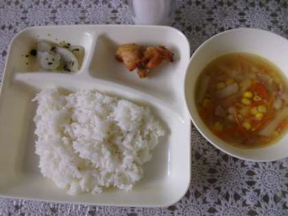 「タンドリーチキン」とは、インド料理のひとつで、ヨーグルトやスパイスなどに漬けこんだ鶏肉をタンドールという釜で焼いた料理です。給食では、鶏肉ににんにく、塩、こしょう、ヨーグルト、カレー粉、ケチャップで下味をつけて焼きました。ふわっとカレーの香りのする、ボリュームのある一品でした。