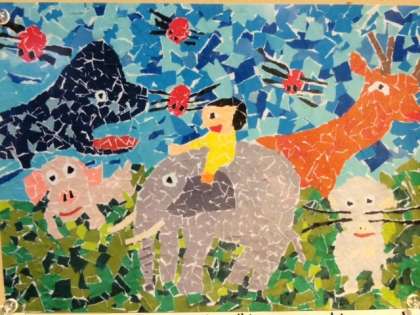第32回大阪市読書感想画コンクール入賞で2年 竹田 楓花 さんが優秀賞に選ばれました。みんなで冒険に出かける様子が、ちぎられた折り紙で、色鮮やかに表現されている作品です。この作品は、中央図書館1階に展示されています。