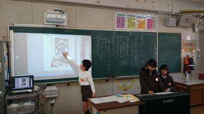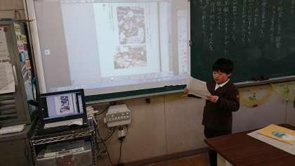 2枚の写真資料から分かったことをまとめ、発表メモを作りました。電子黒板を使い、上手に発表することができました。総合的な学習の時間など、“プレゼンテーション”の能力が求められます。これからの様々な場面で活かしてほしい力ですね。