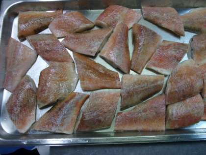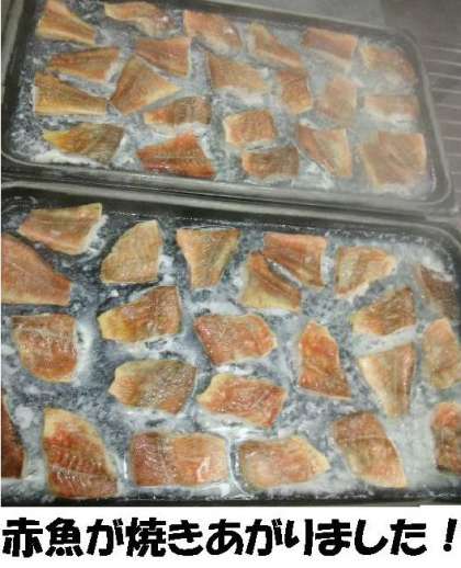 今日の献立に「赤魚のレモンじょうゆかけ」がありました。一塩をした赤魚の切り身を焼き物機で焼き、レモン汁とみりん、うす口しょうゆを合わせたたれをかけました。レモンは広島県でとれた国産のものを使いました。爽やかなレモンの香りのする食べやすい一品に仕上がりました。