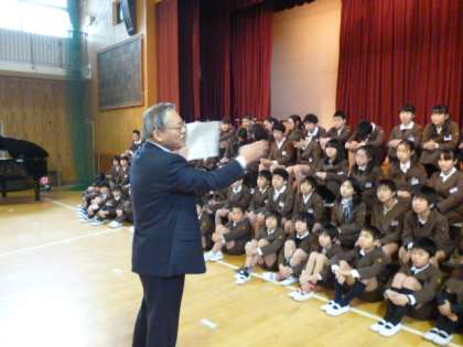 日吉小学校の山下前校長先生に、6年生の合唱をご指導していただきました。山下先生のわかりやすい適格なご指導により、それぞれのパートがきれいに揃うようになり、見違えるような歌声になりました。