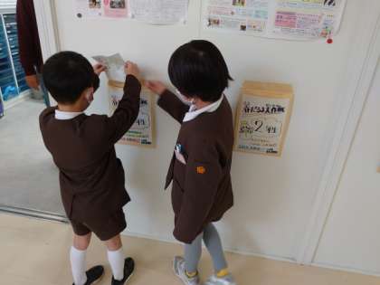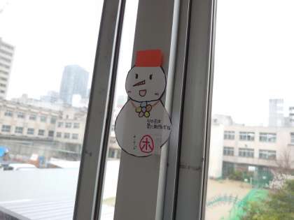 校舎内に貼られた雪だるまならぬ「春だるま」を探して、書いてある文字を並べてキーワードを作る遊びです。