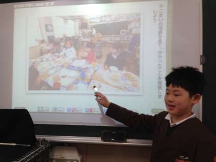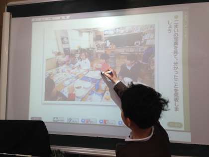 発表者が前に立ち、電子黒板やペン機能を使って発表しています。