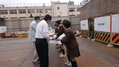 6年生後期運営委員が児童を代表して、校舎建築に関わっていただいている、都市整備局の建築・設備・電気担当の方、そしてそれぞれの業者の方にお礼の言葉と3年生児童からのメッセージを渡しました。