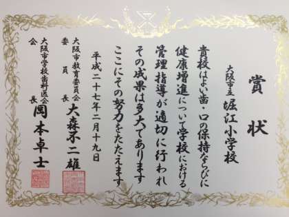 堀江小学校の児童の、歯・口の健康状態がよいと表彰を受けました。