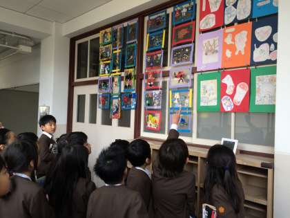 イラストクラブとアートクラブの作品が会議室に展示されています。
