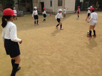 今日は、チームを変えてラインサッカーのゲームをしました。