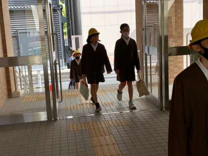 6年生の児童が入学式の前日準備のために新しい玄関を通り登校してきました。
