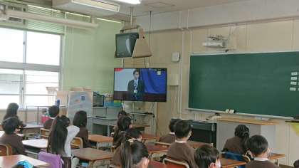 1学期は3年生と6年生が講堂で参加し、他の学年はテレビ放送での参加です。